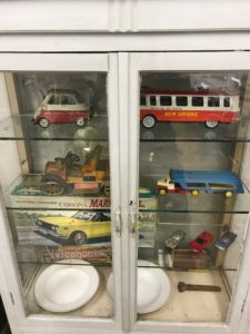 ゆらゆらガラスの素敵な木製のケビントにブリキのおもちゃがこれまた可愛らしく鎮座している。